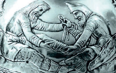О существовании у скифов врачей - профессионалов свидетельствует удивительный памятник изобразительного искусства Куль-Обская ваза, найденная в 1901 году при раскопках кургана близ г. Керчь. Ваза изготовлена из золота в V–IV веках до н. э. На ней искусной рукой мастера запечатлен образ врача - скифа, оказывающего медицинскую помощь другому скифу – войну. На одном из изображений врач делает перевязку конечности, на другом - удаляет зуб.